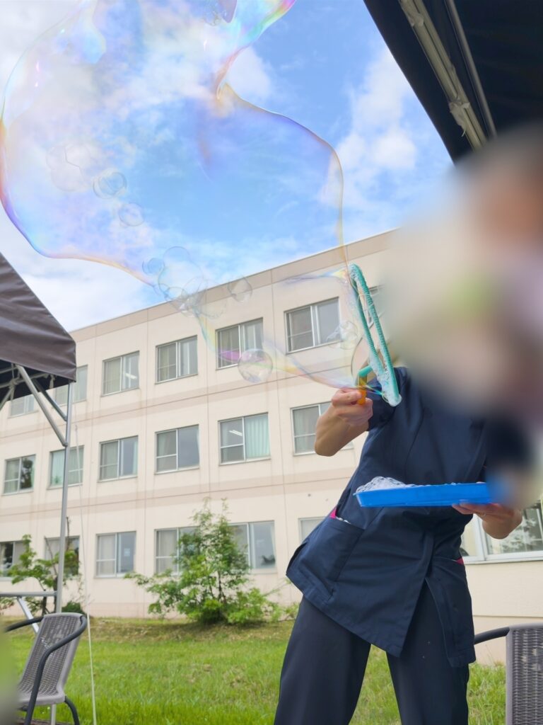 お天気のいい時には中庭にお散歩に出かけたり、シャボン玉や屋外での歌レクもしました。
